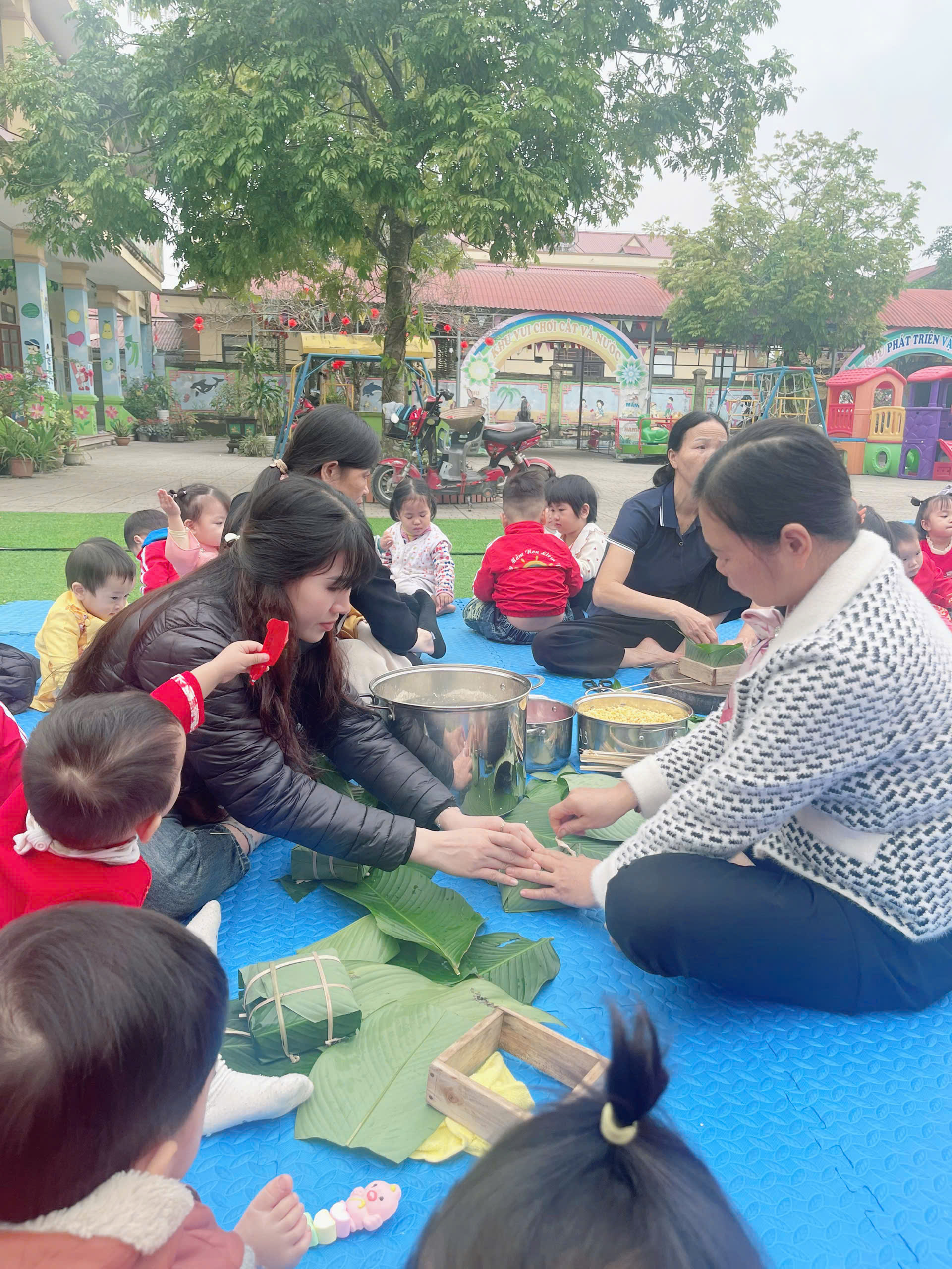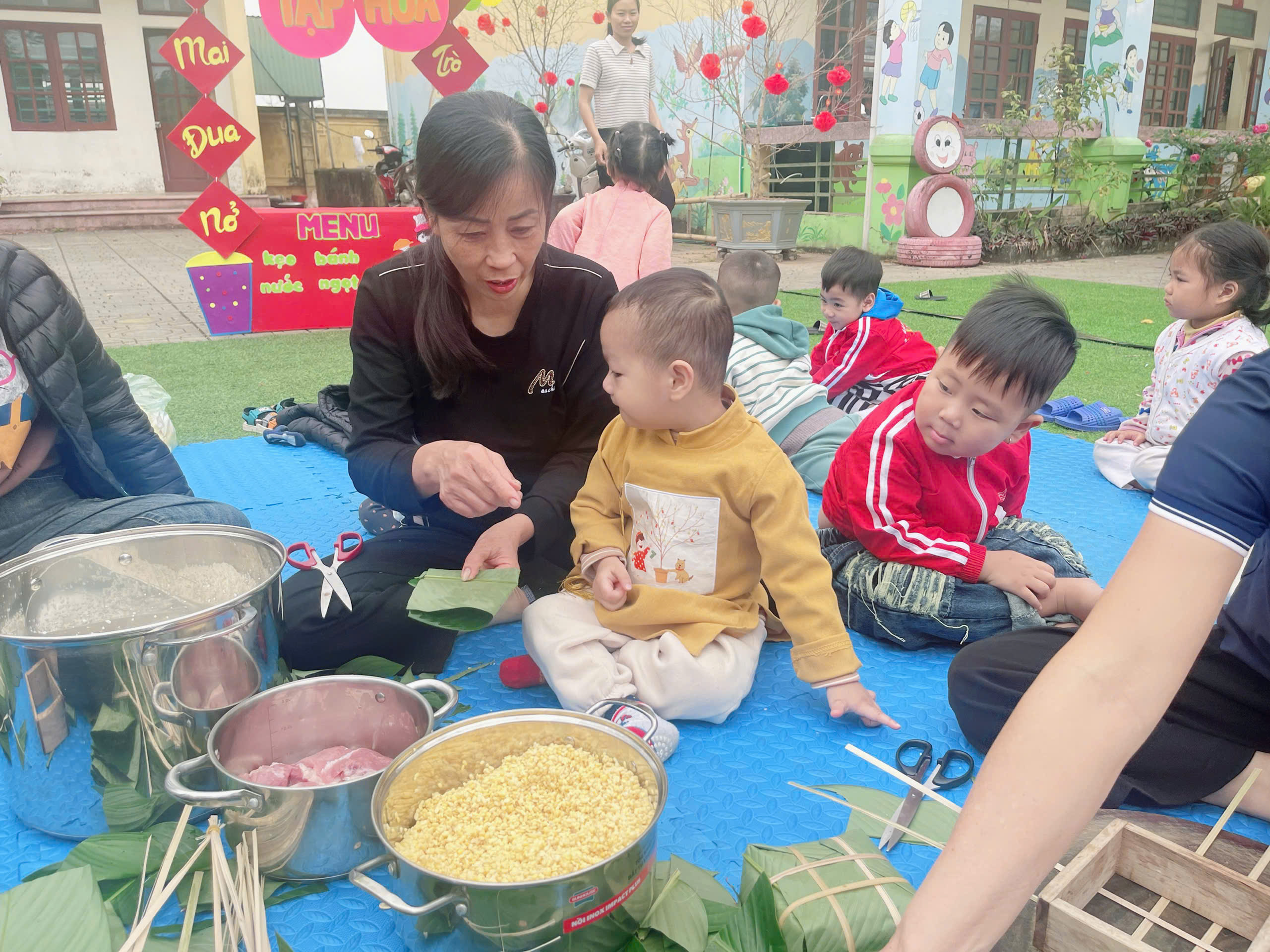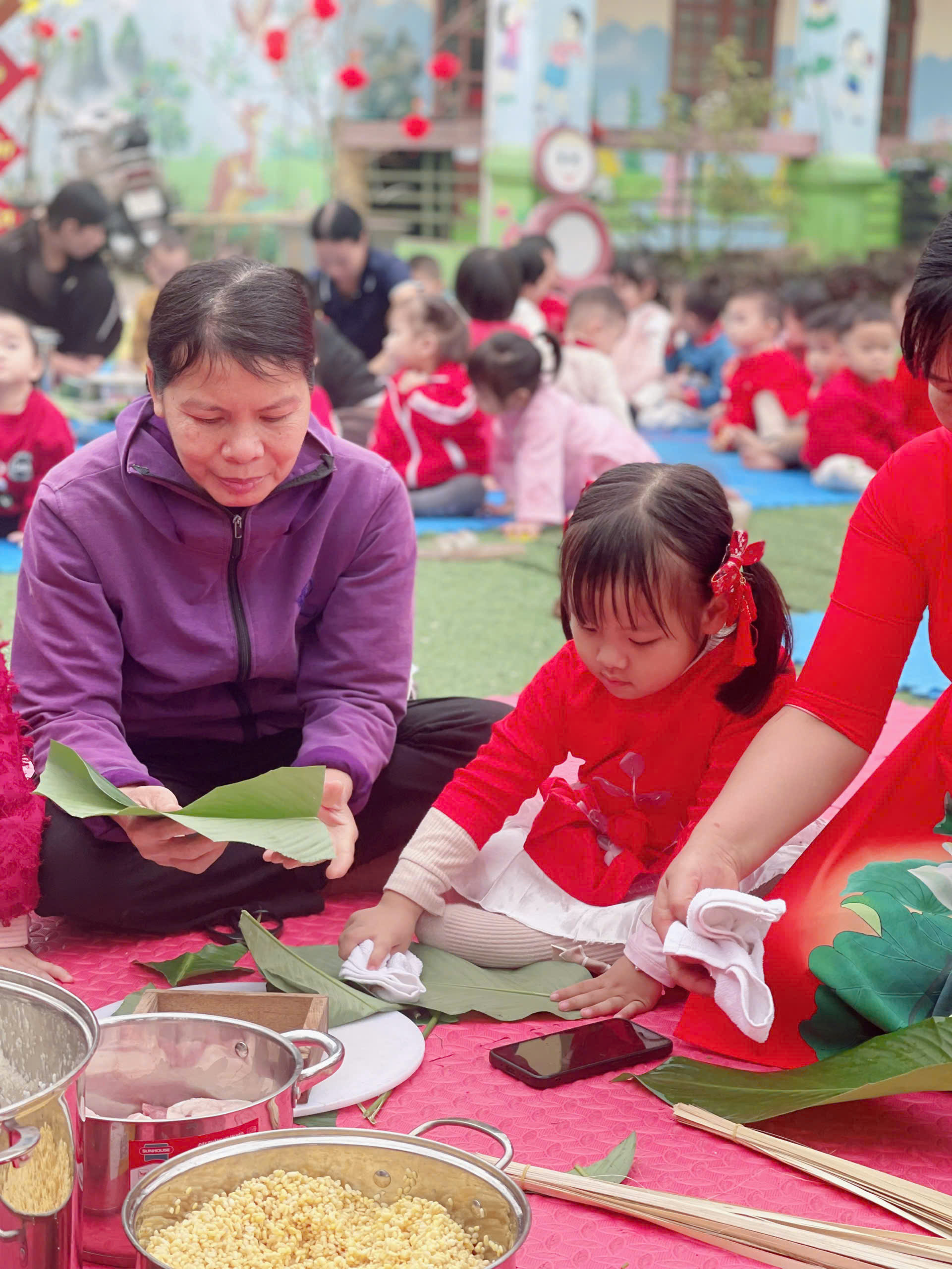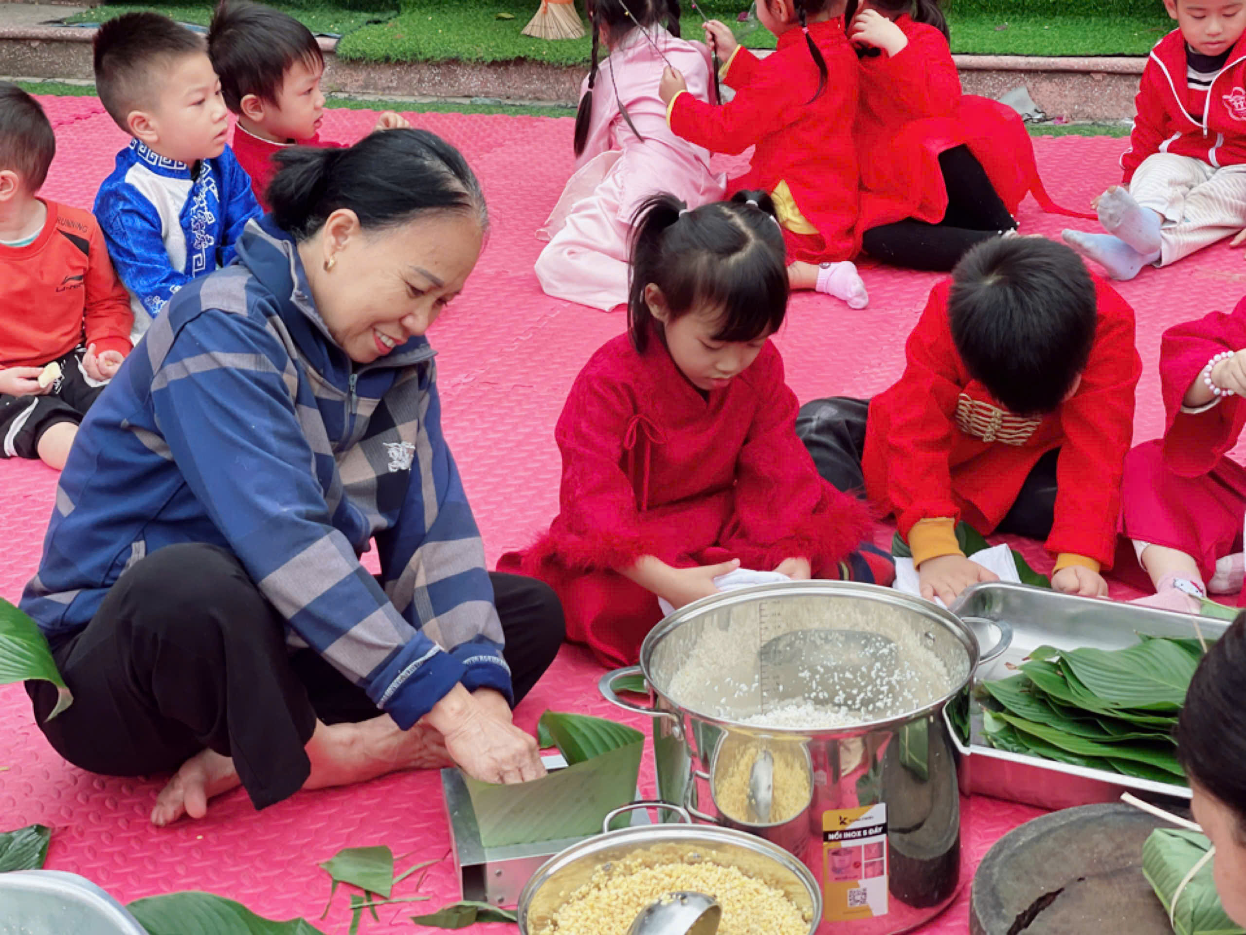 Dưới sự hướng dẫn tận tình của các cô giáo, các bé được tìm hiểu ý nghĩa của chiếc bánh chưng ngày Tết và trực tiếp tham gia gói bánh. Những đôi tay nhỏ xinh cẩn thận xếp lá, cho gạo, đậu… đã tạo nên những khoảnh khắc đáng yêu, giúp trẻ thêm yêu quý và trân trọng nét đẹp văn hóa dân tộc.