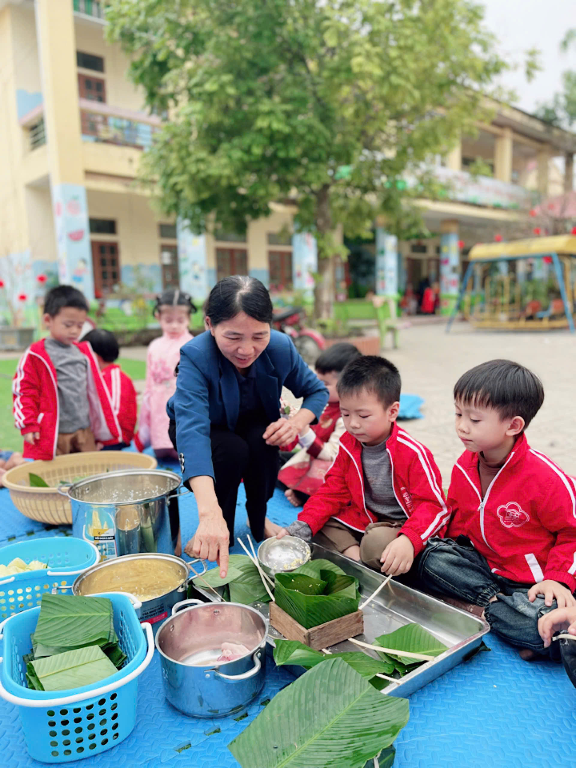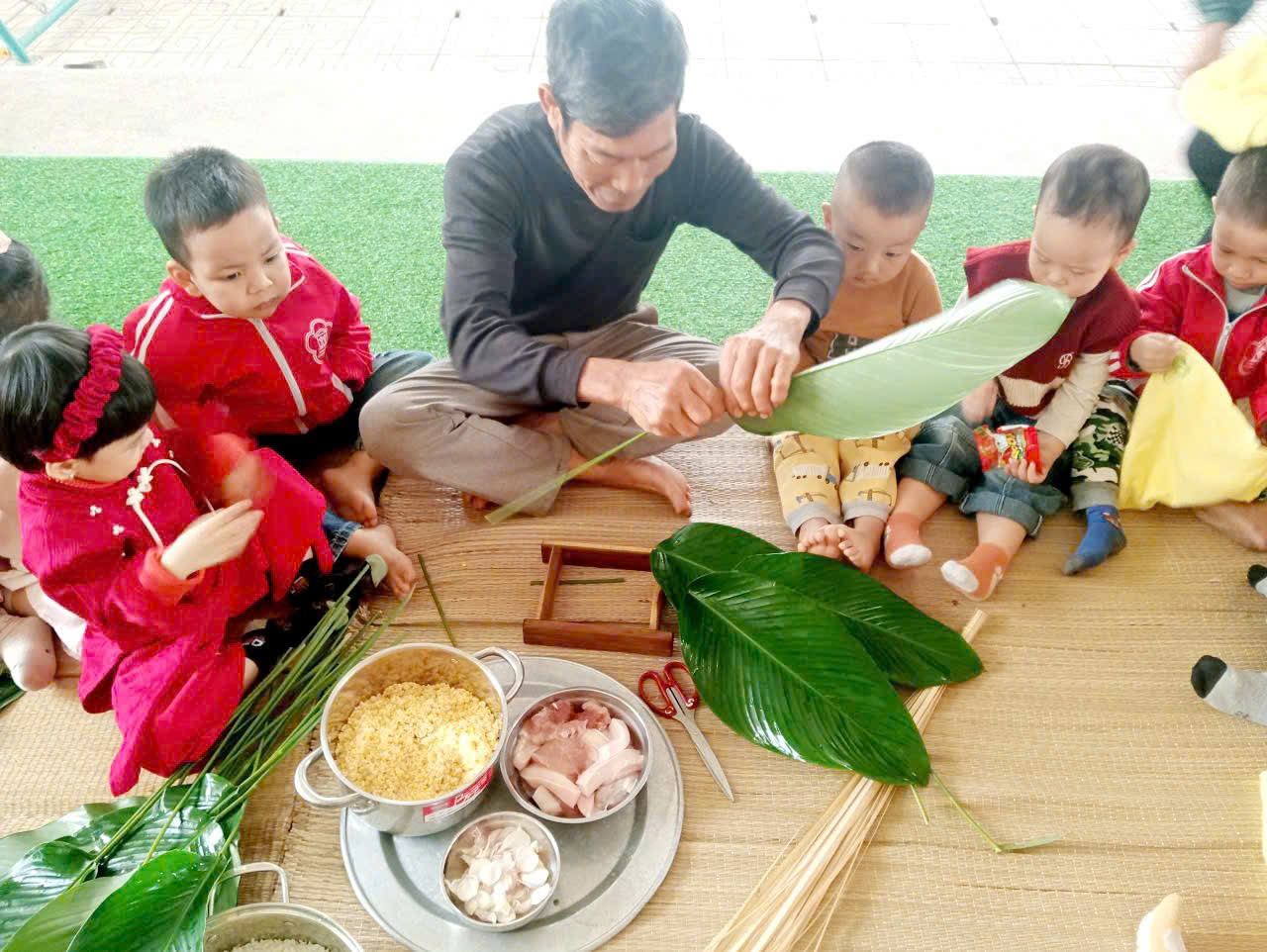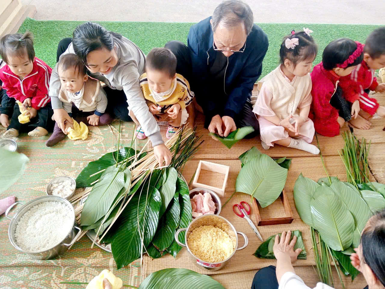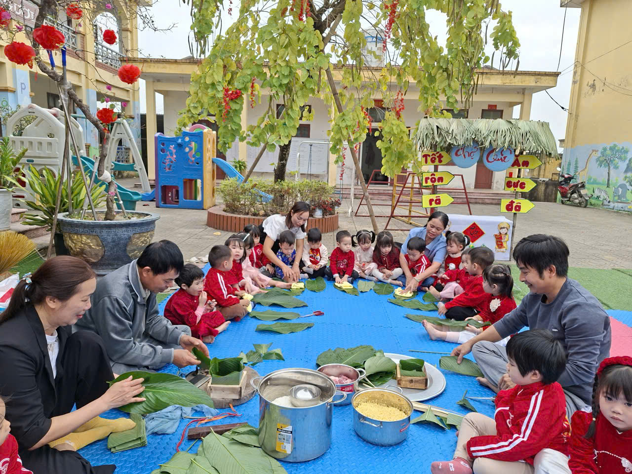 Dưới sự hướng dẫn tận tình của các cô giáo, các bé được tìm hiểu ý nghĩa của chiếc bánh chưng ngày Tết và trực tiếp tham gia gói bánh. Những đôi tay nhỏ xinh cẩn thận xếp lá, cho gạo, đậu… đã tạo nên những khoảnh khắc đáng yêu, giúp trẻ thêm yêu quý và trân trọng nét đẹp văn hóa dân tộc.