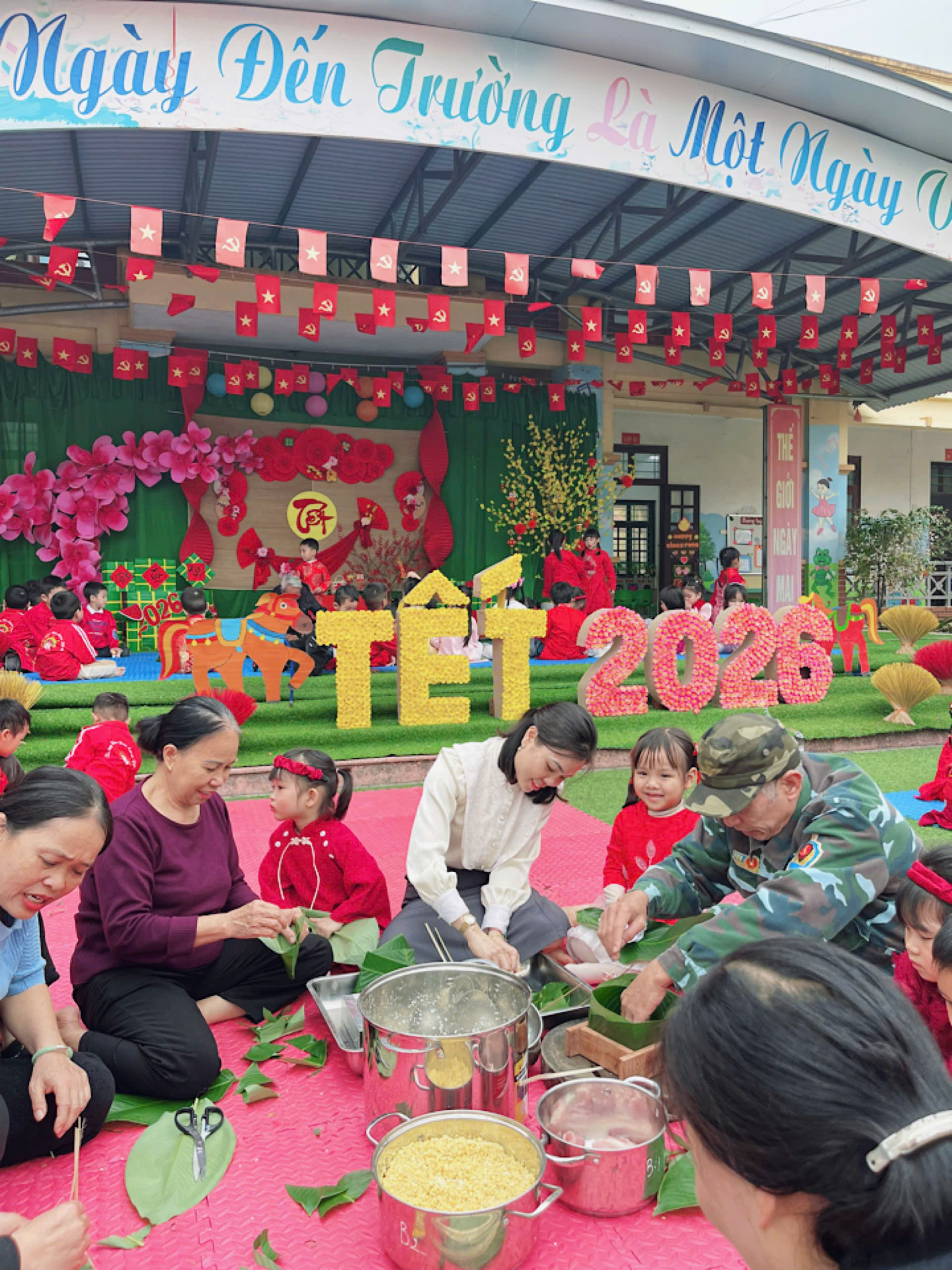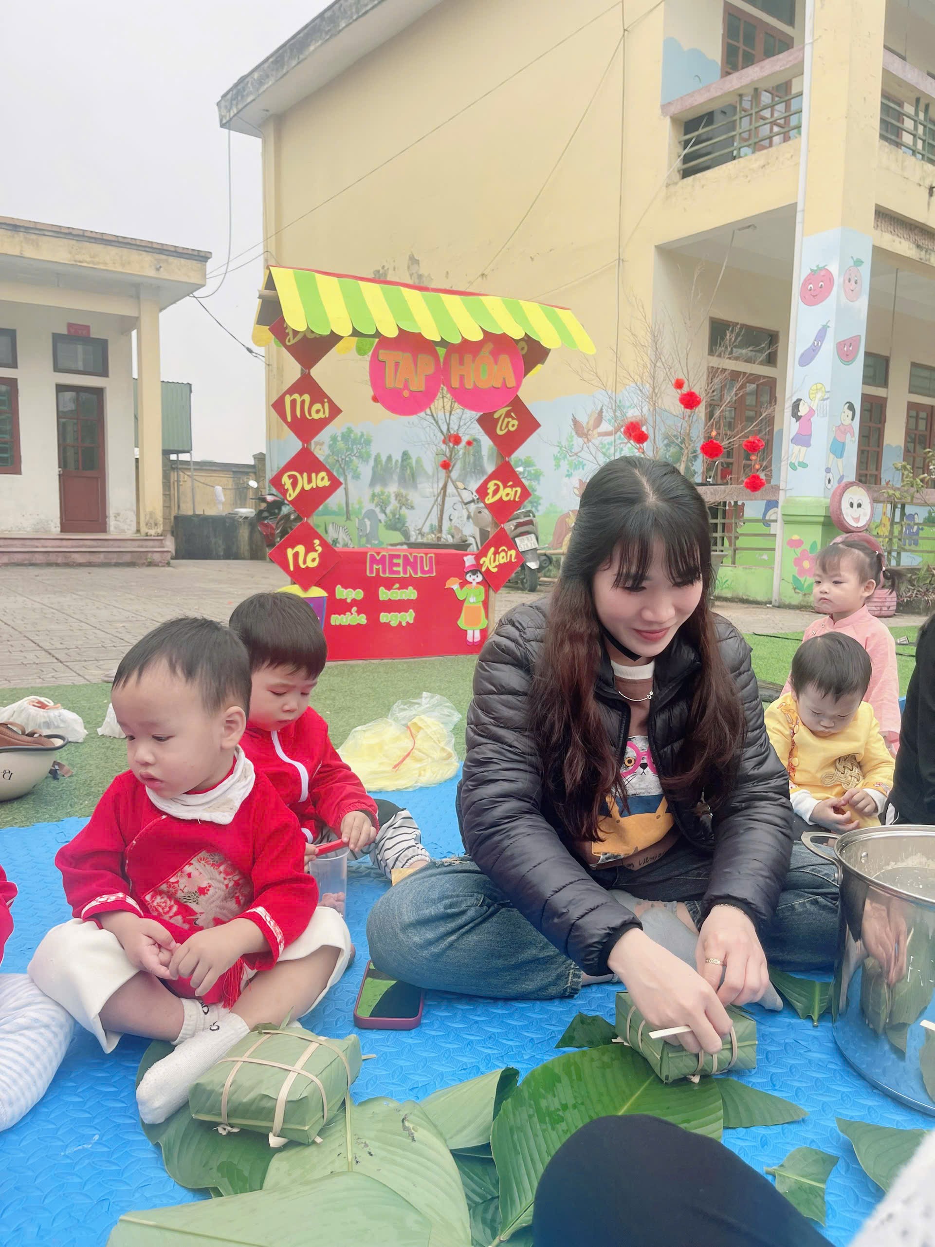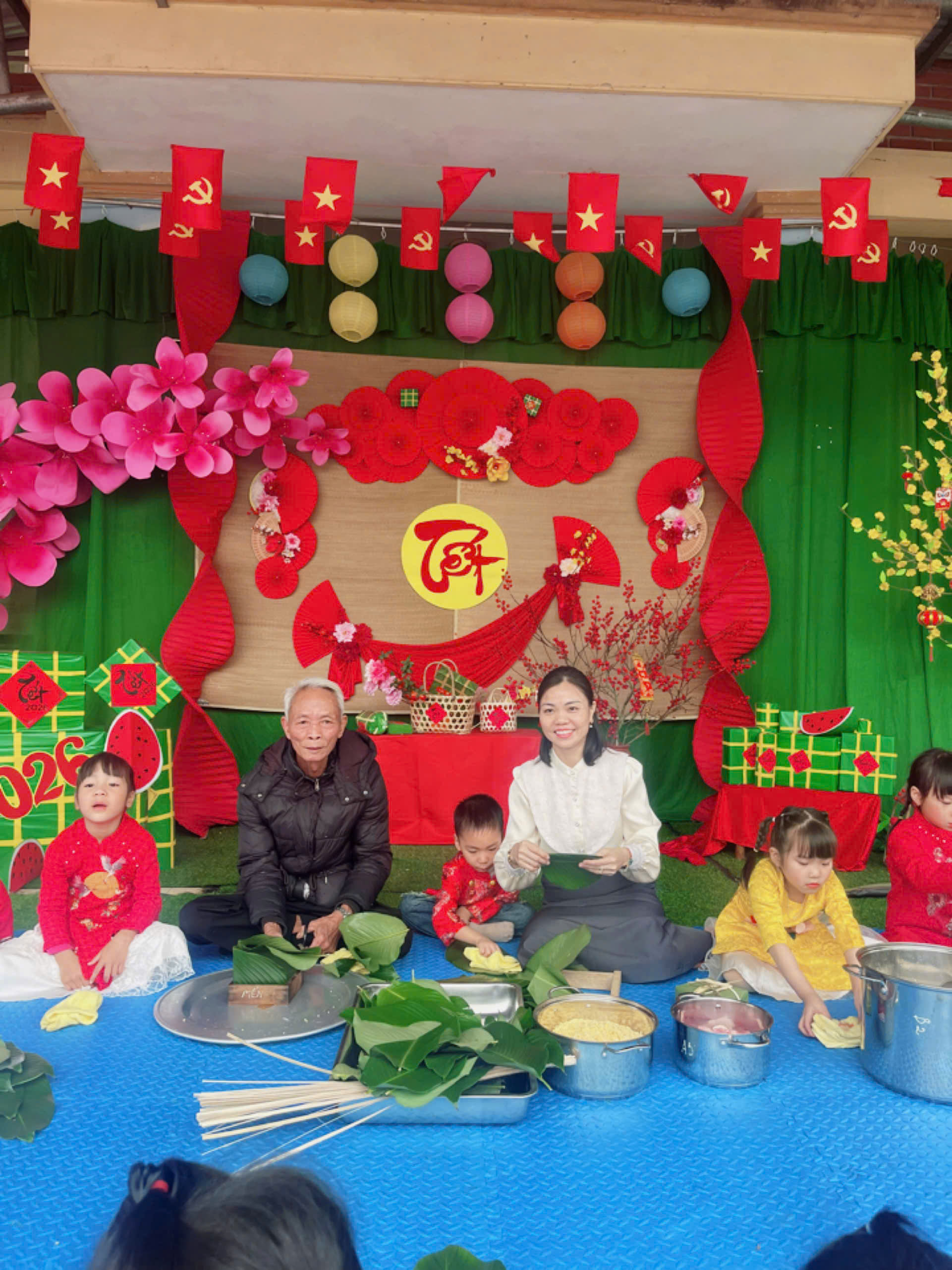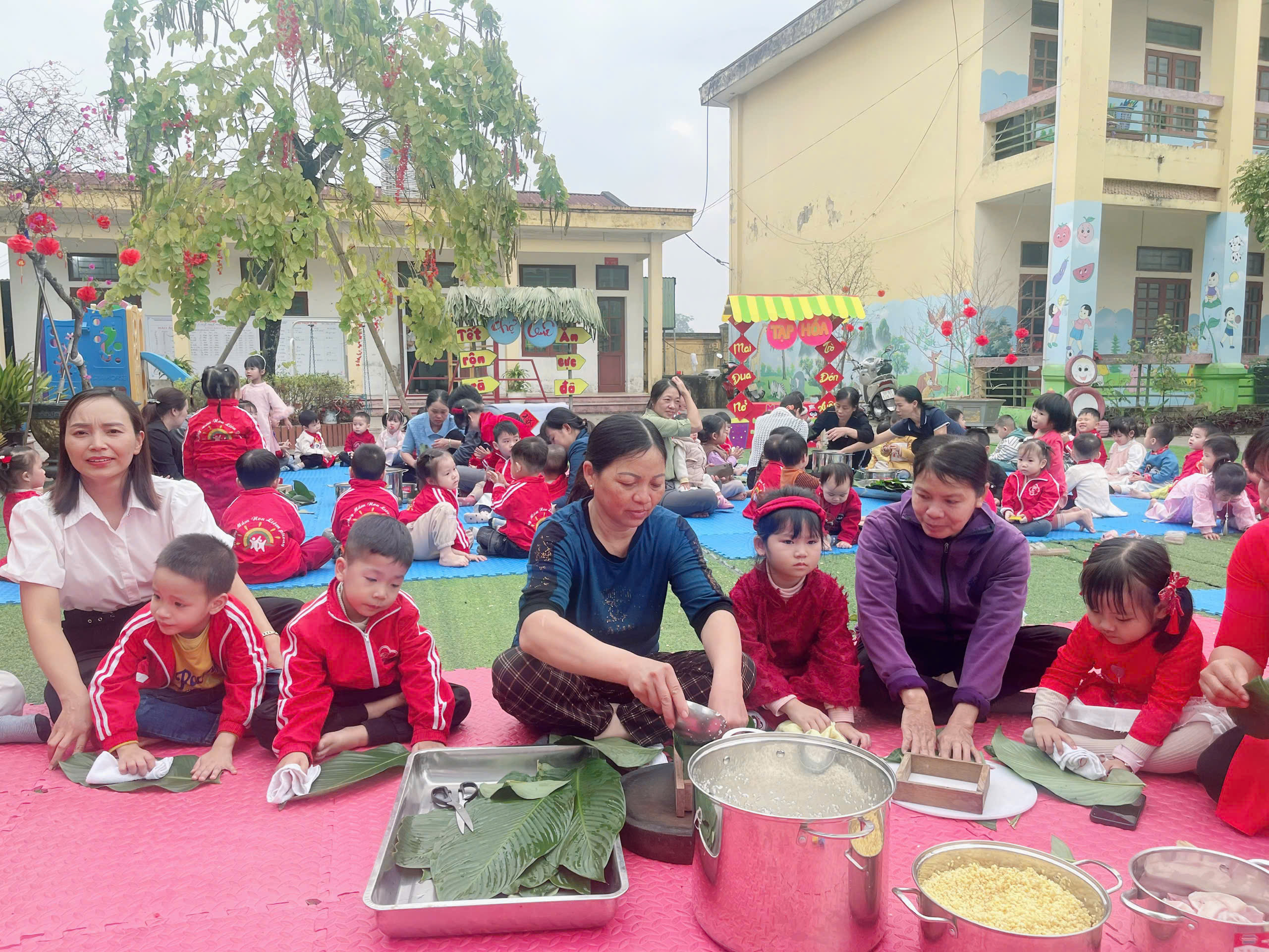 Dưới sự hướng dẫn tận tình của các cô giáo, các bé được tìm hiểu ý nghĩa của chiếc bánh chưng ngày Tết và trực tiếp tham gia gói bánh. Những đôi tay nhỏ xinh cẩn thận xếp lá, cho gạo, đậu… đã tạo nên những khoảnh khắc đáng yêu, giúp trẻ thêm yêu quý và trân trọng nét đẹp văn hóa dân tộc.