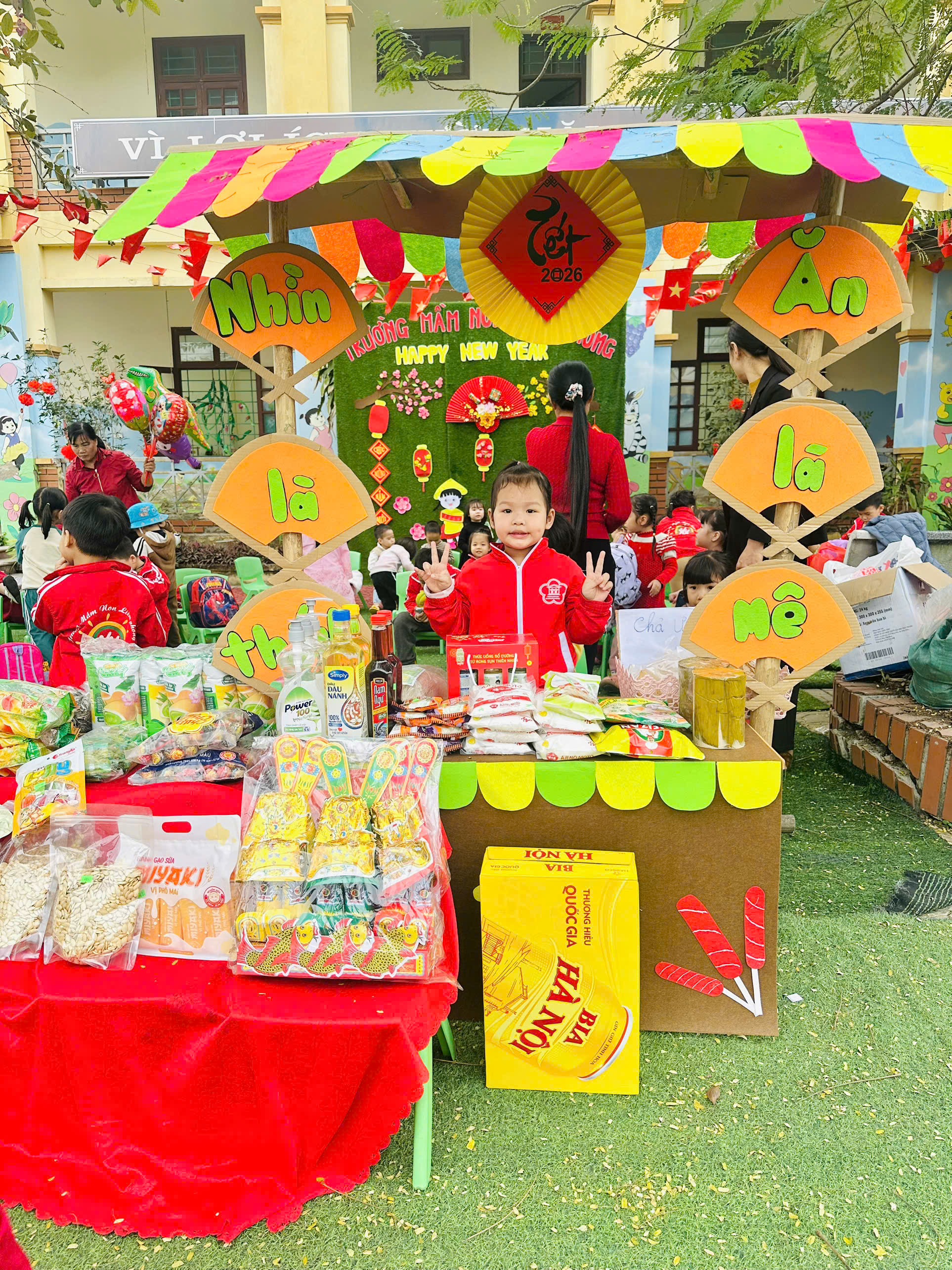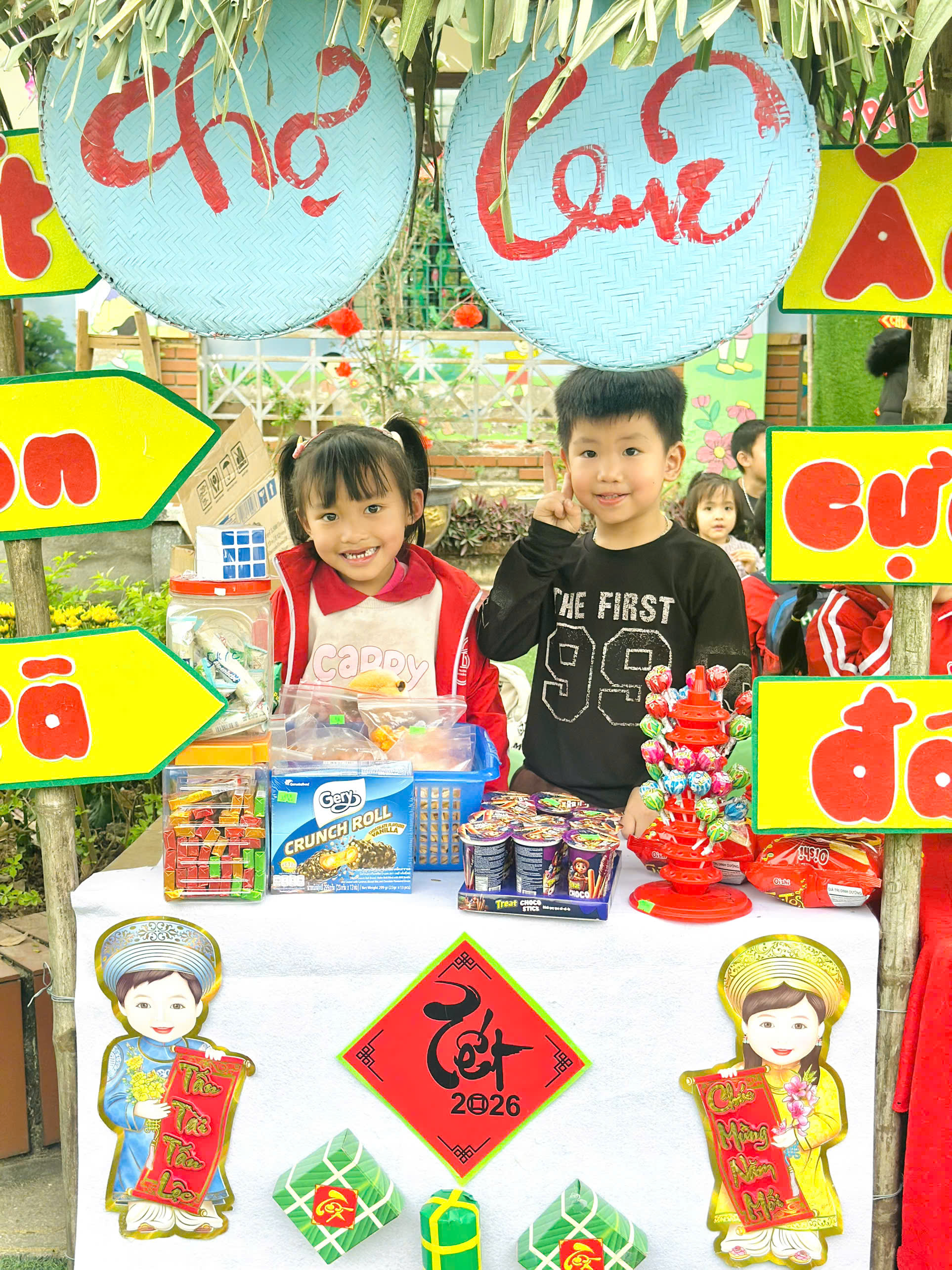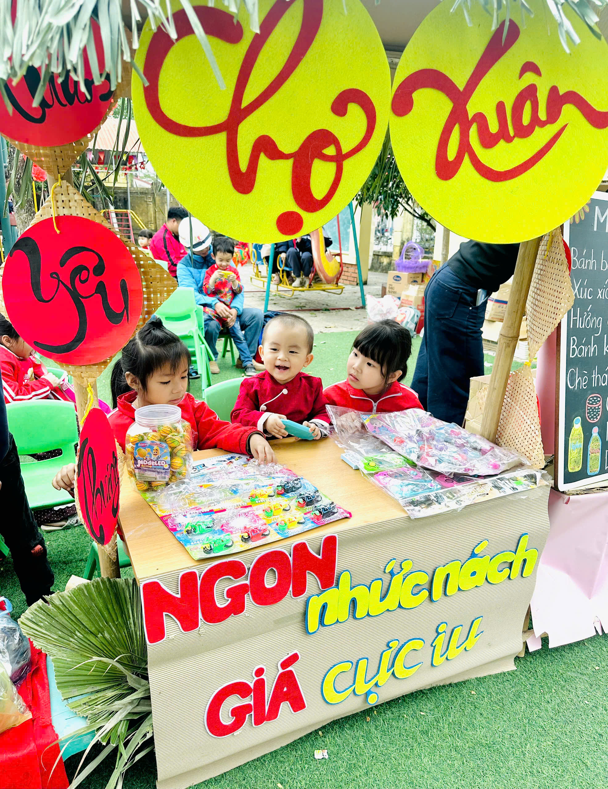 Các bé được tham gia tham quan và trải nghiệm các gian hàng mang đậm sắc Xuân như: gian hàng ẩm thực, gian hàng đồ dùng – đồ chơi ngày Tết… Qua hoạt động này, trẻ được làm quen với không khí Tết truyền thống, rèn kỹ năng giao tiếp và học cách chia sẻ, hợp tác cùng bạn bè.