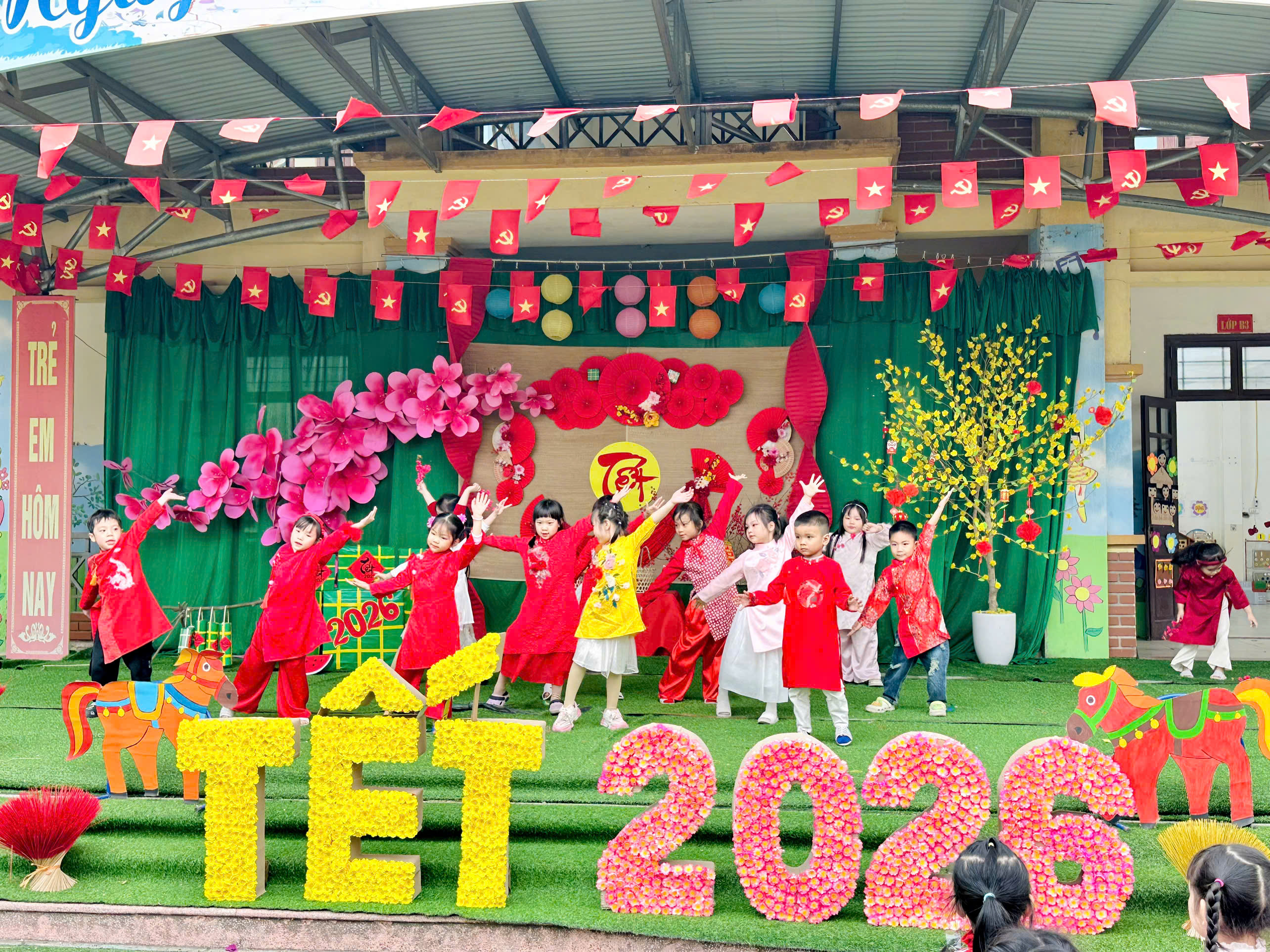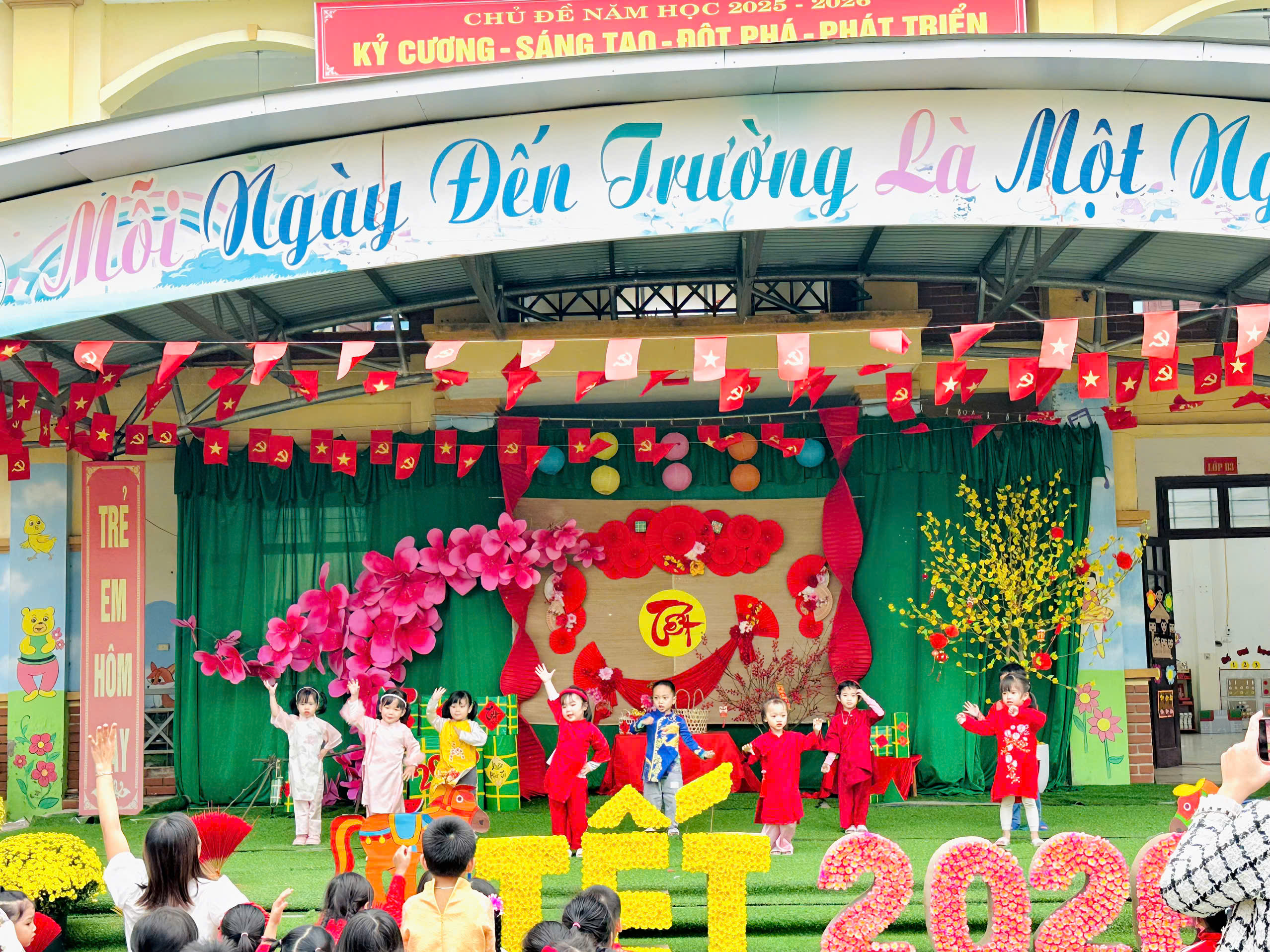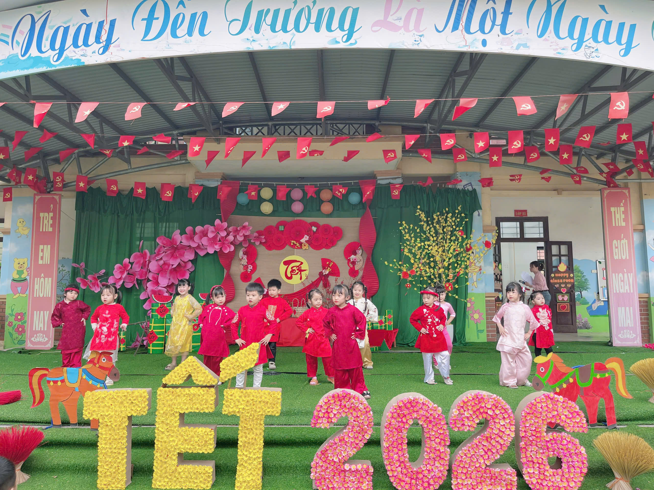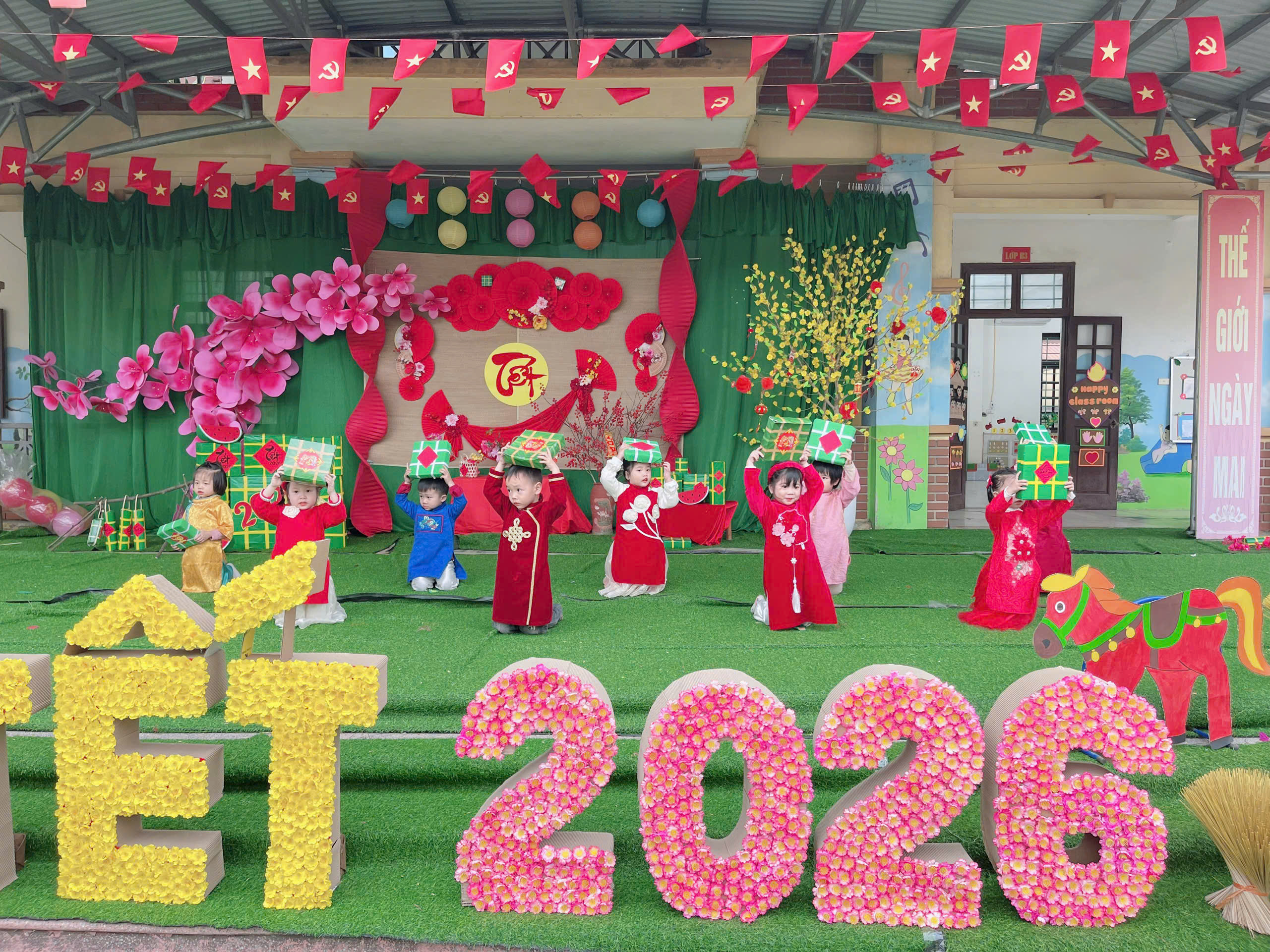 Chương trình văn nghệ chào Xuân diễn ra trong không khí vui tươi, rộn ràng với những tiết mục múa, hát đầy sắc màu. Các bé tự tin biểu diễn, mang đến không khí vui tươi, ấm áp, lan tỏa niềm vui và tiếng cười khắp sân trường.